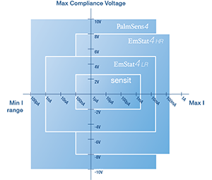 EmStat4S 低レンジ・バージョンは、1 nA までの低電流範囲を必要とするアプリケーションに最適ですが、高レンジ・バージョンは、最大 200 mA の最大電流を必要とするアプリケーションに非常に適しています。