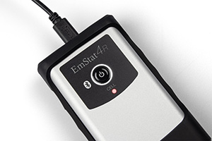 EmStat4S は、電気化学インピーダンス分光法 (EIS) 用のポータブル USB 電源ポテンシオスタット、ガルバノスタット、およびオプションの周波数応答アナライザー (FRA) です。